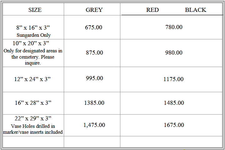 Any custom designs not shown in the catalog will be an additional fee. Inquire for quote. No markers are allowed at cemetery, without cemetery approval, through email.